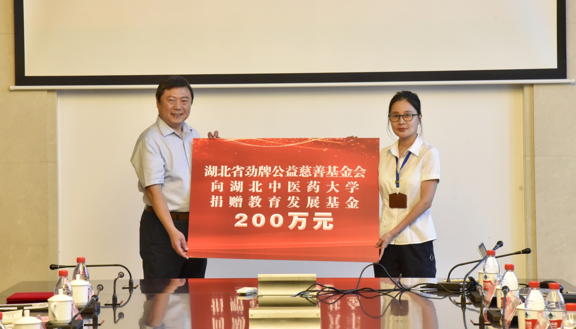 勁牌公益慈善基金會副理事長吳曉敏授予湖北中醫藥大學辦公室主任汪海洋捐贈牌。